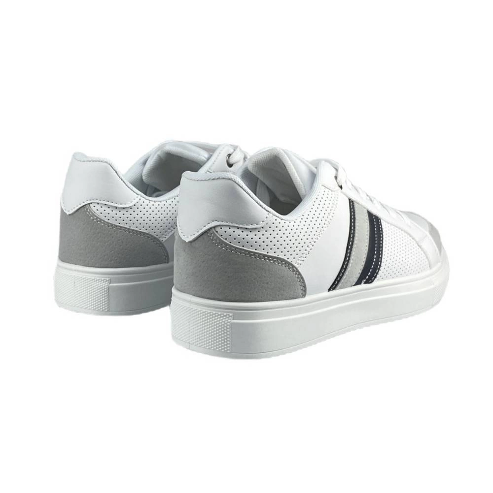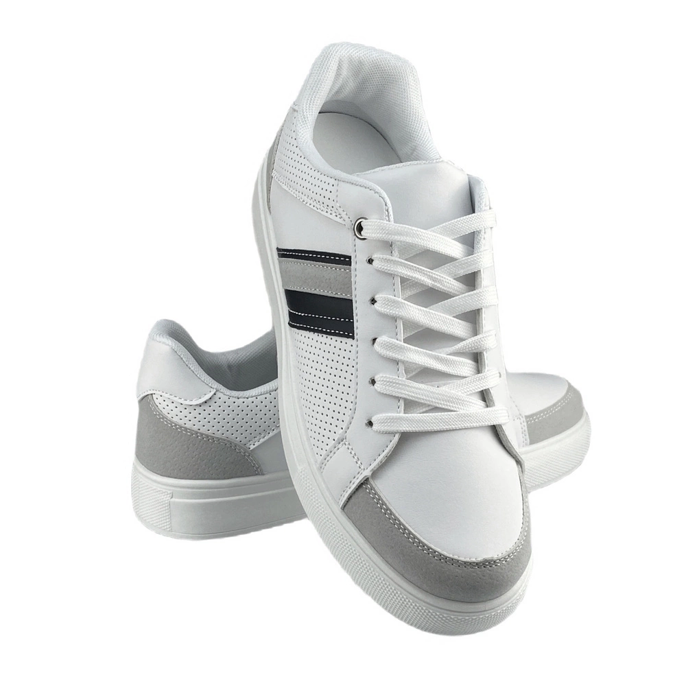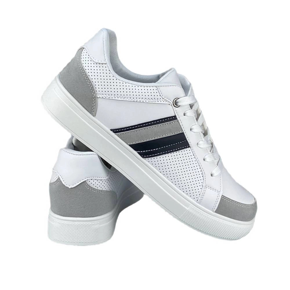 Made of ecological leather and suede in gray and white, placed on an abrasion-resistant white sole.