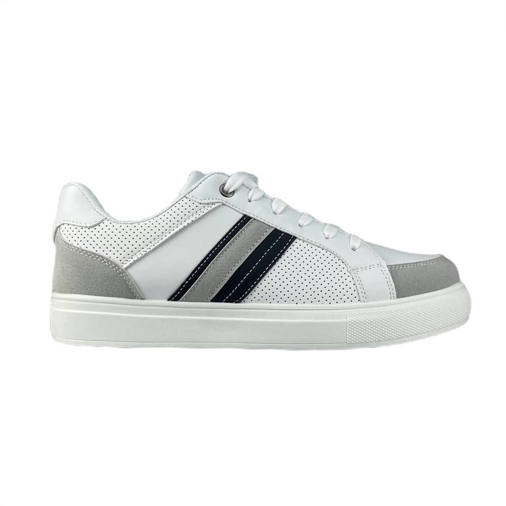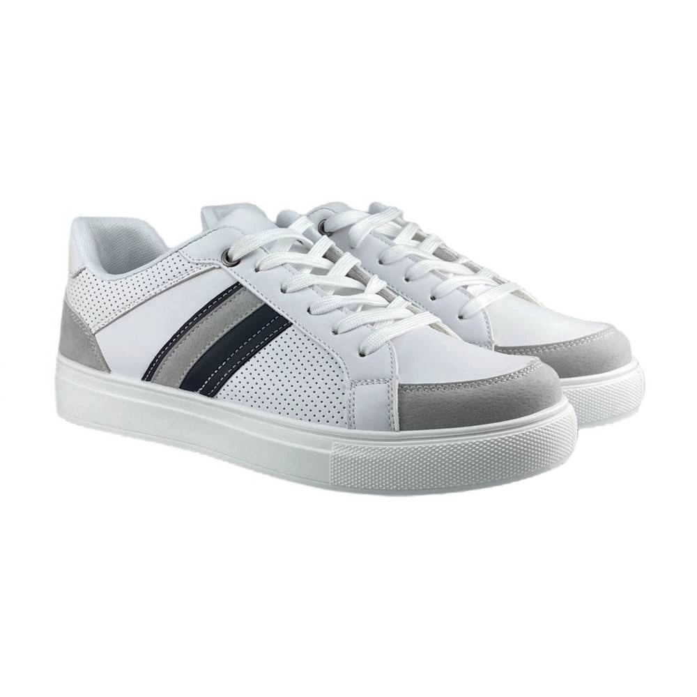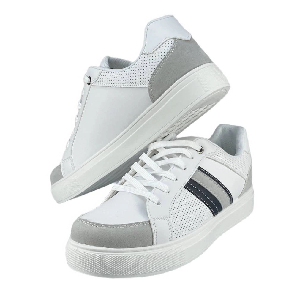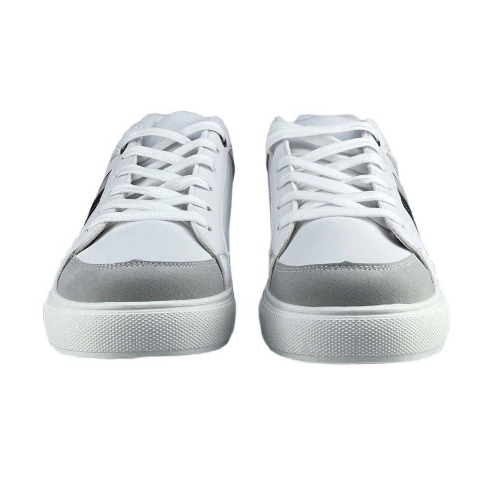 Made of ecological leather and suede in gray and white, placed on an abrasion-resistant white sole.